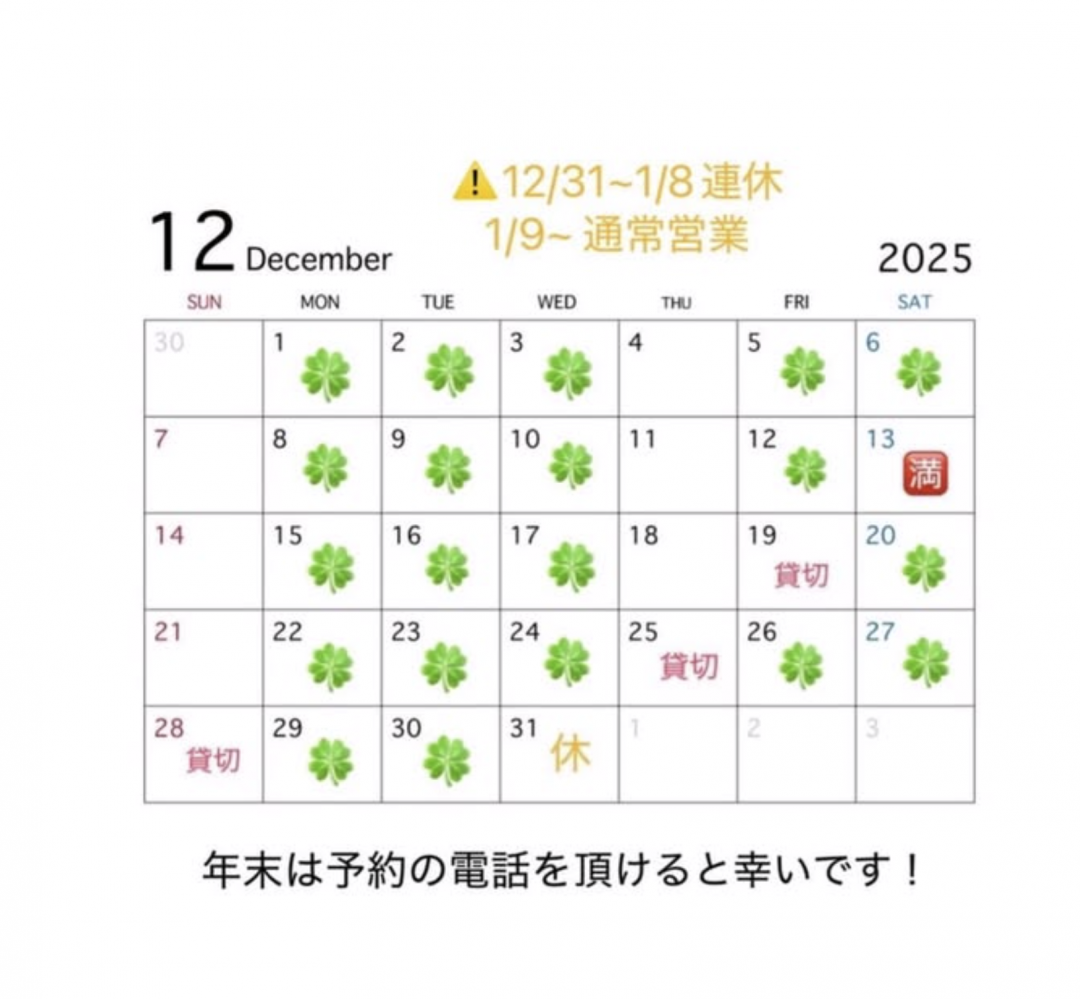 年内のよつば営業予定です🏮 🍀マークのところはまだご予約いただけます!! 個室もありますのでぜひお問い合わせください💨